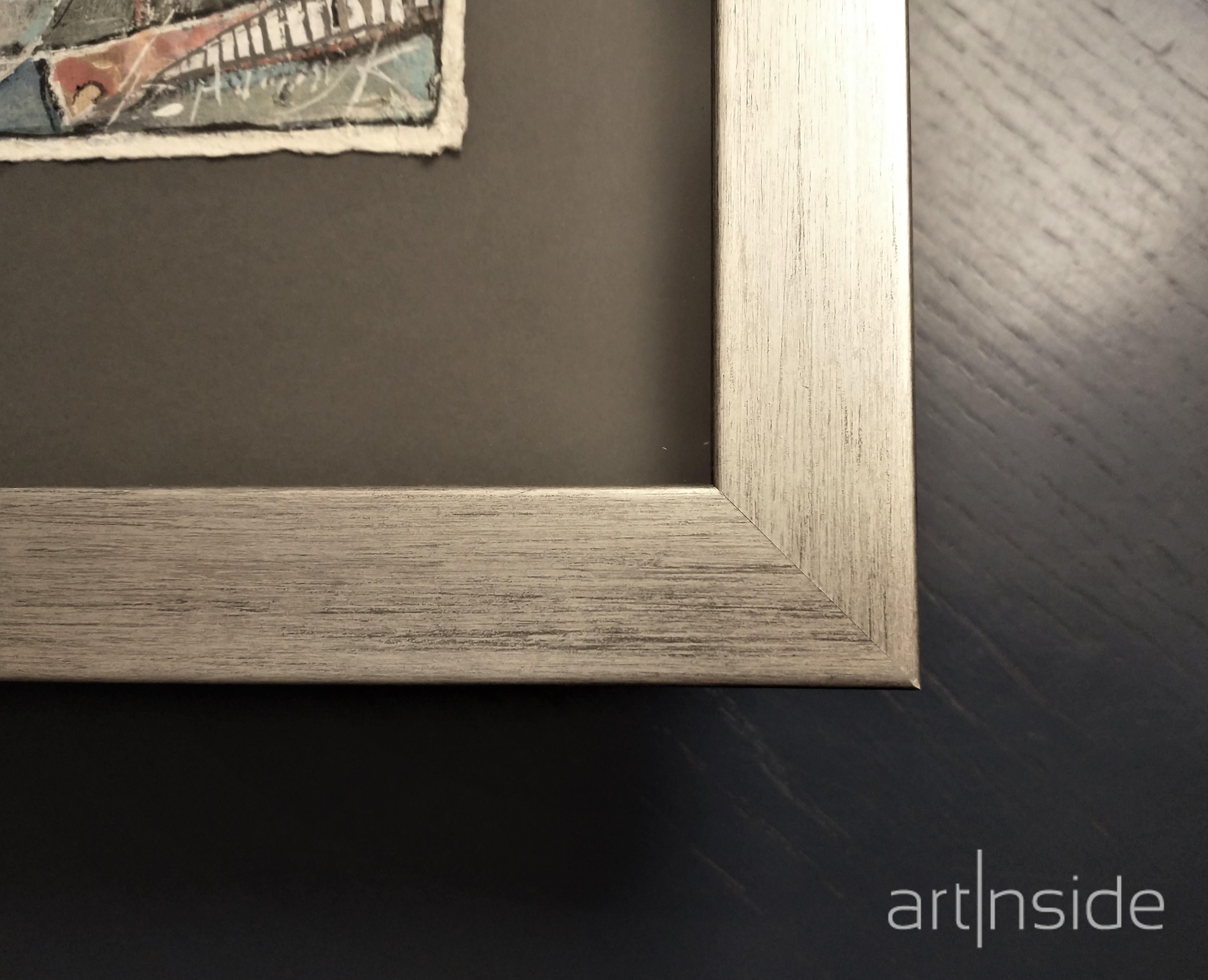 Obraz oprawiony w drewnianą, przecieraną, srebrną ramę, profil o wymiarach 3x3 cm. Obraz w ramie: 50x44 cm.