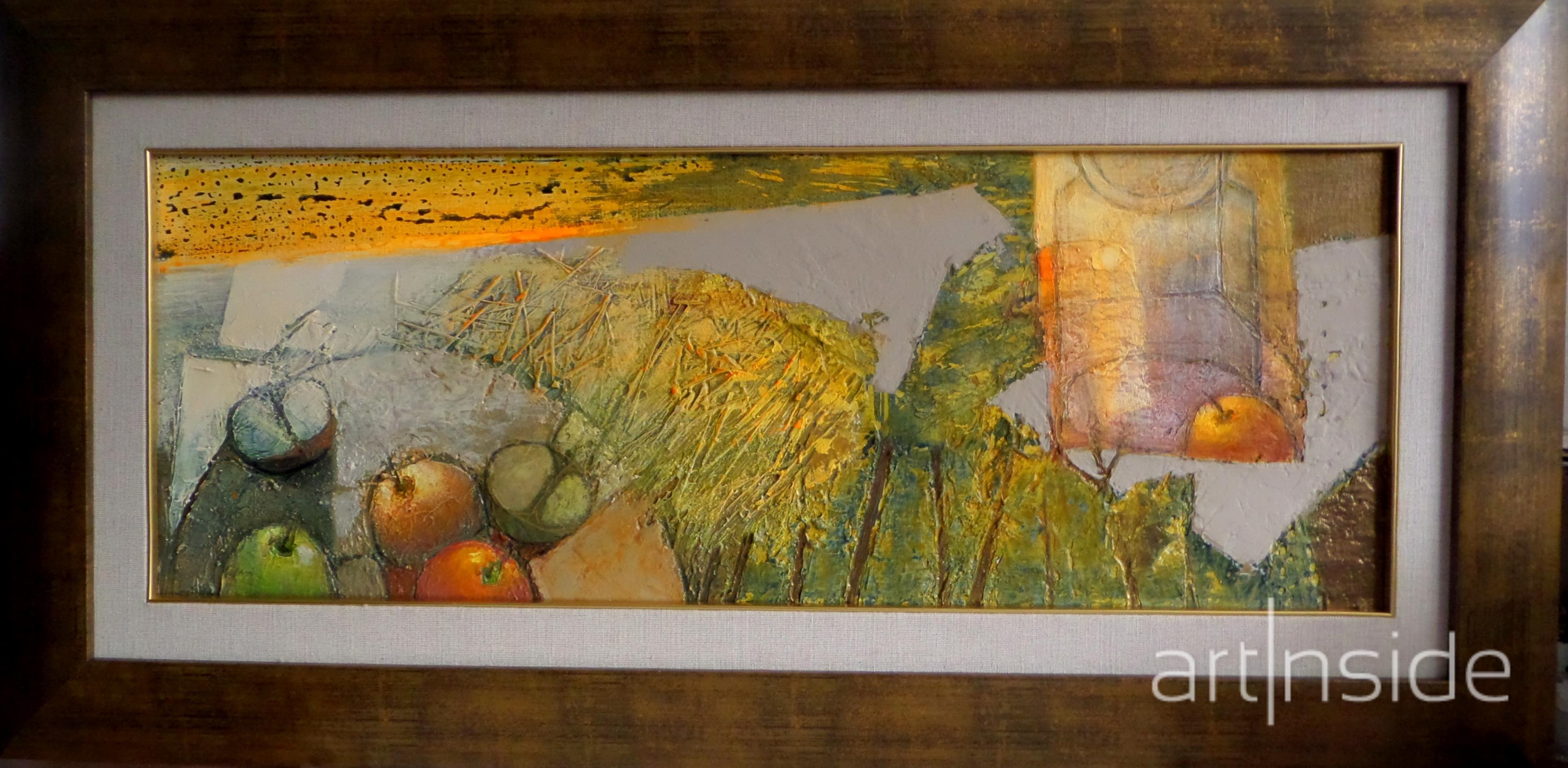 Obraz w passpartout z szarego płótna oraz drewnianej, brązowej ramie.